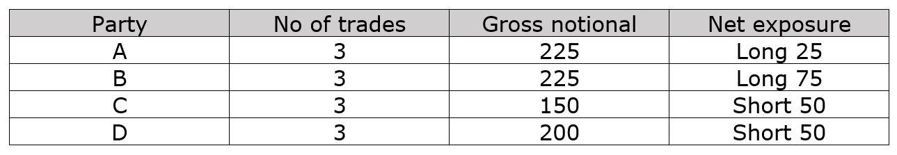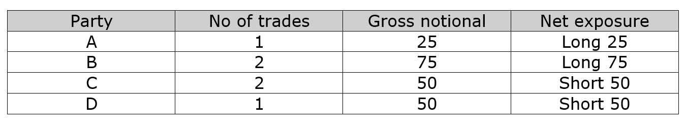 As we can see, the net exposure remains the same after compression but the gross exposure and the number of trades have changed. The total gross notional after compression is 100 (a compression of 4 times – from 400 notional to 100 notional) and the number of trades is 3 (a compression of 50% - from 6 trades to 3).