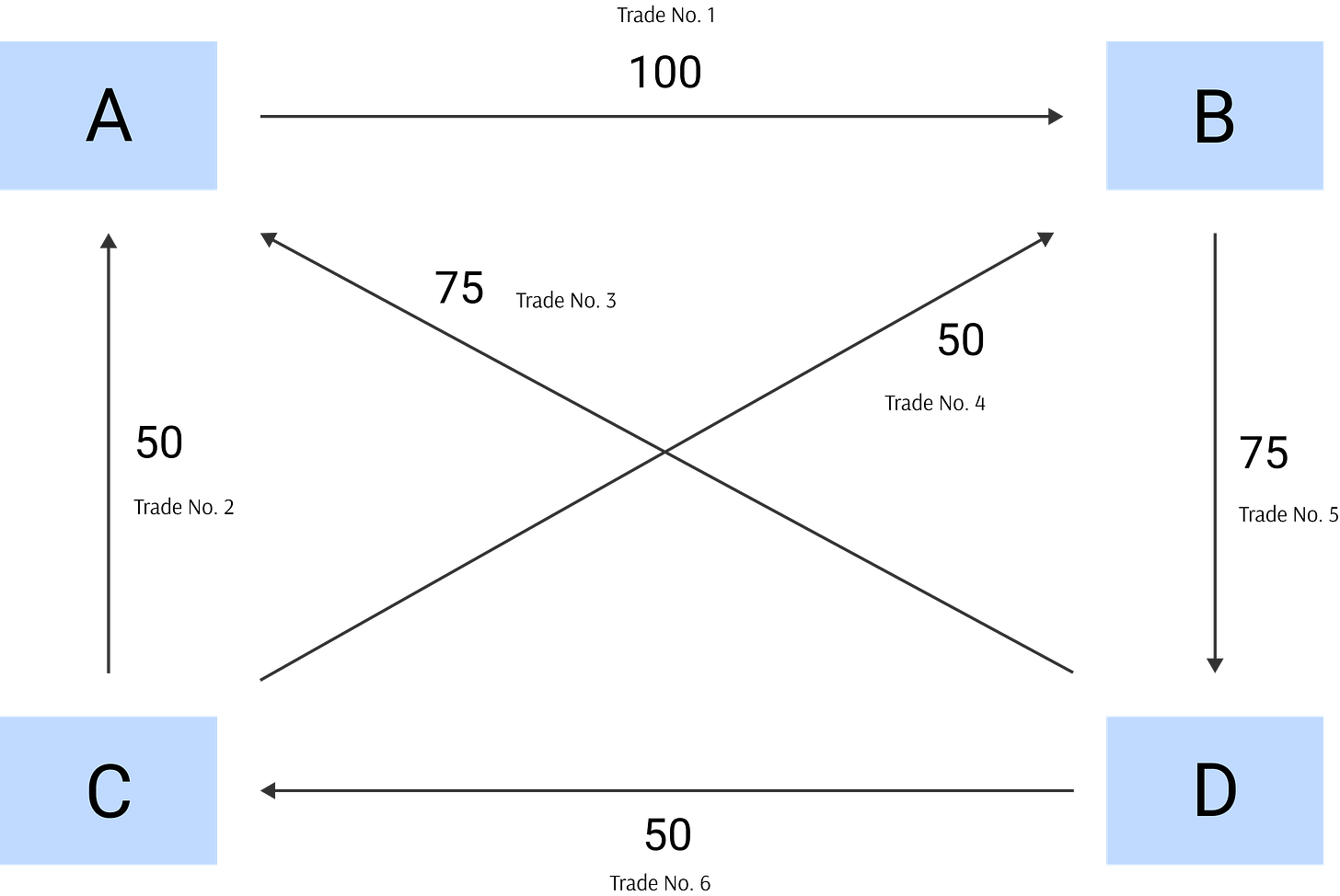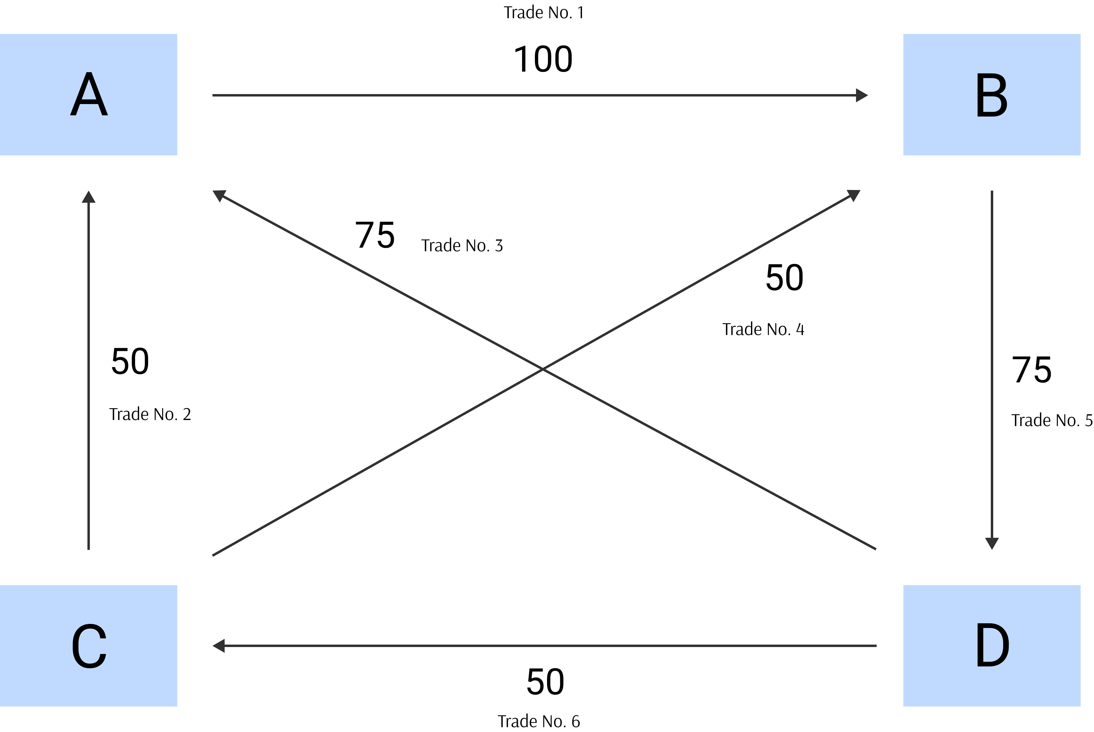 The gross notional of all the six trades is 400 and the net open interest (sum of all long and short positions) is 100. These trades can be compressed as follows.