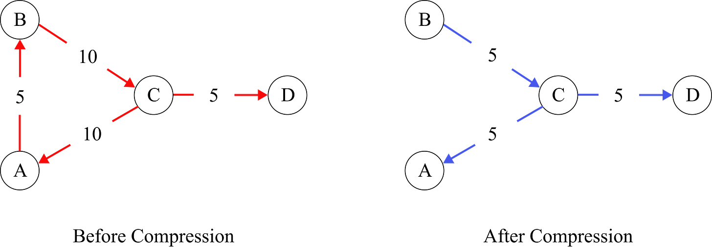 Ideally, compression would eliminate all such cycles of trades from a network. In practice, all cycles may not be eliminated as it requires parties to voluntarily participate and agree to compress trades. The general market practice is that firms take the help of third-party vendors that provide compression as a service and remove only certain trades from their portfolio. While submitting the trades for compression, firms provide their constraints and tolerances.